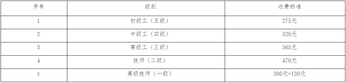 根据原河南省发展计划委员会、省财政厅联合下发的《关于调整全省机关事业单位工人技术等级考核报名考务费的通知》(豫计收费〔2001〕1612号)、《关于印发<河南省党政机关短期培训收费管理办法>的通知》(豫计收费〔2003〕2303号);河南省发展和改革委员会、省财政厅联合下发的《关于机关事业单位技术工人考核评审和<技师资格证书>收费问题的函》(豫发改收费函〔2004〕500号),报考河南省机关事业单位工勤技能岗位等级培训考核收费标准如下表: